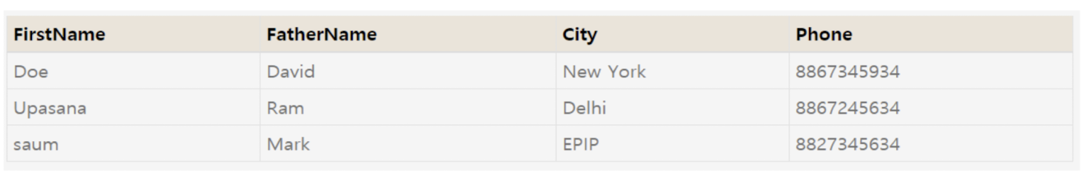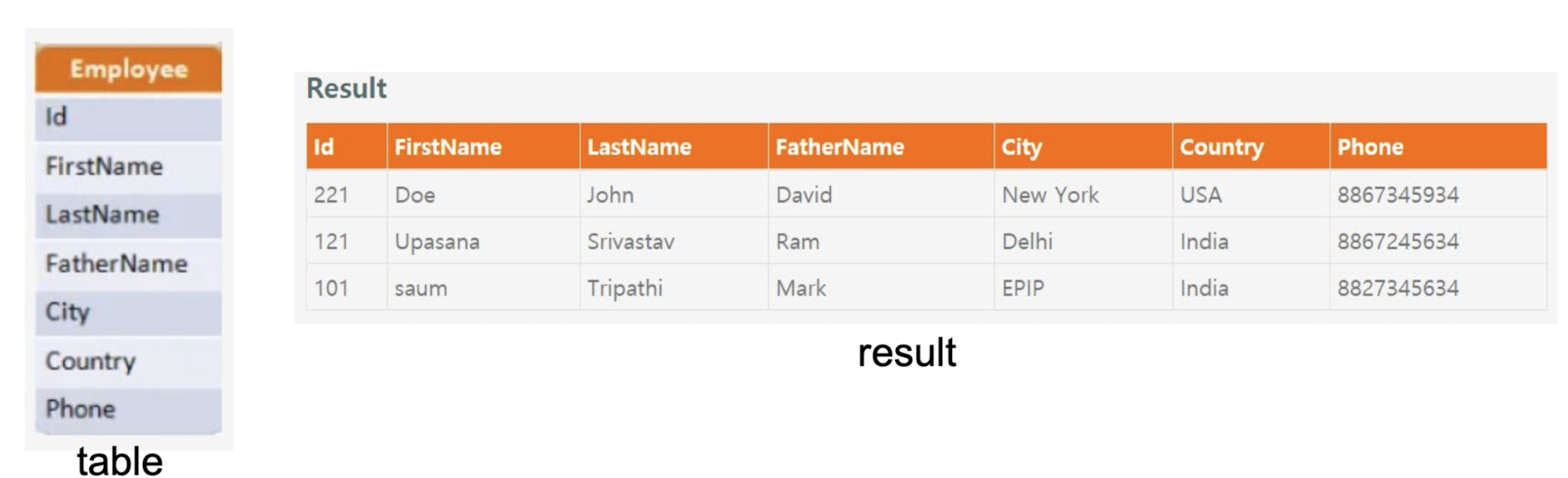 - Employee 테이블에서 first name, father name, city & phone 선택
