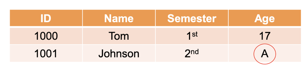 - Age 의 'A'는 허용되지 않음--> 나이(Age)는 integer attribute 입니다.