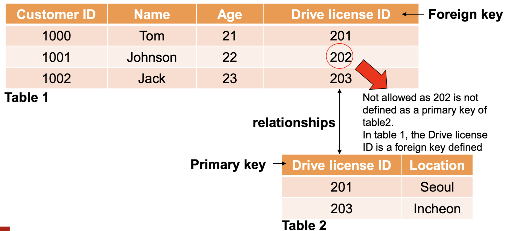 - 참조 무결성 제약 조건에서는 테이블 1의 foreign key(외래 키)가 테이블 2의 primary key(기본 키)를 참조하면 테이블 1의 foreign key의 모든 값은 null이거나 테이블 2에 있어야 합니다.
