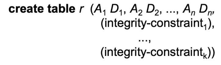 - DDL은 integrity constraints(무결성 제약 조건)을 지정하기 위한 명령을 포함합니다.