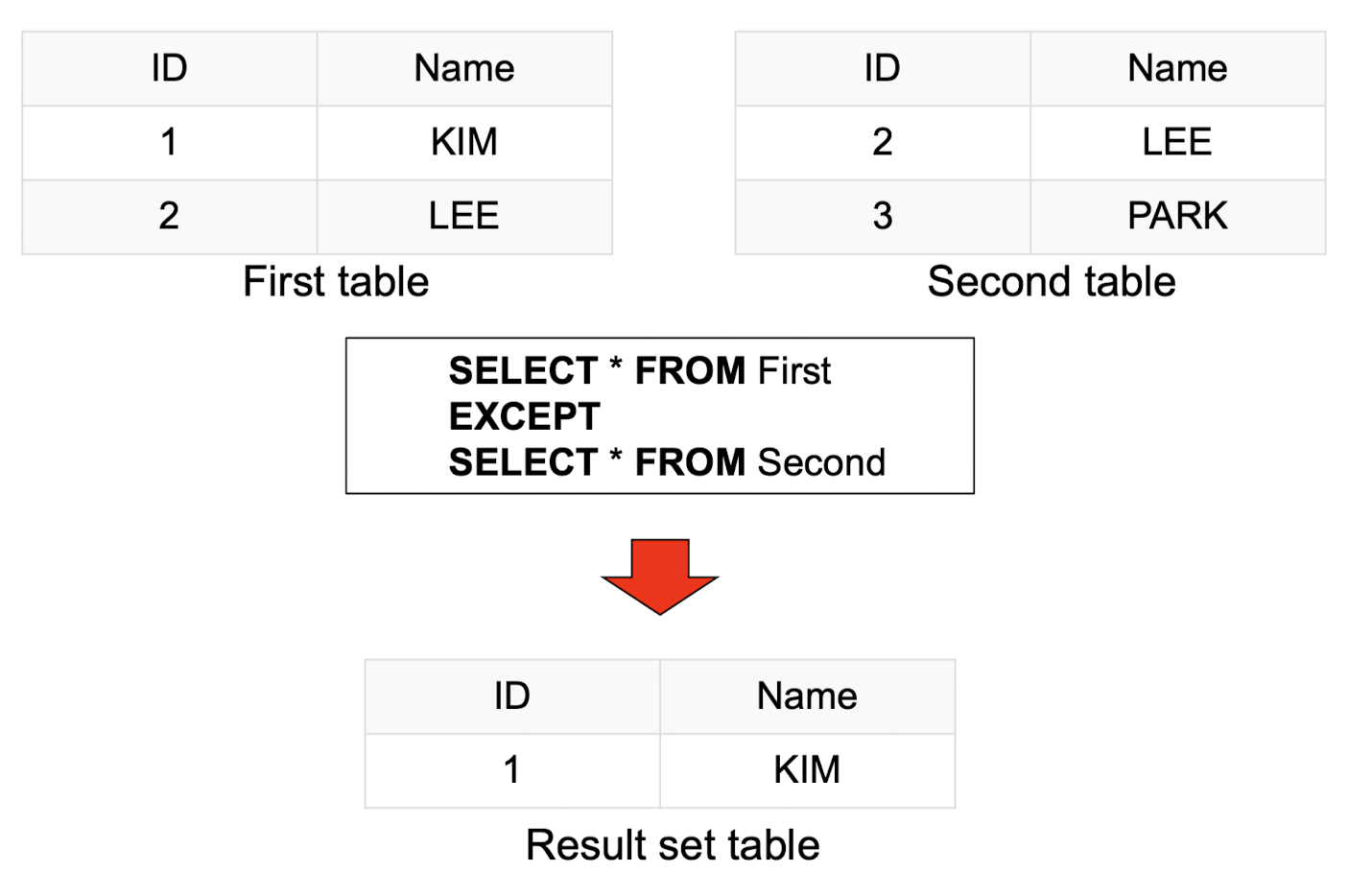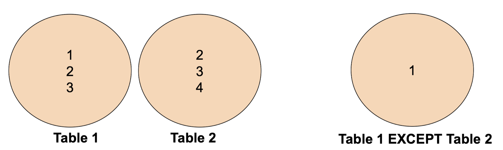 - Except 연산은 두 SELECT 문 결과를 결합하여 첫 번째 집합에 속하는 결과만 반환합니다.
