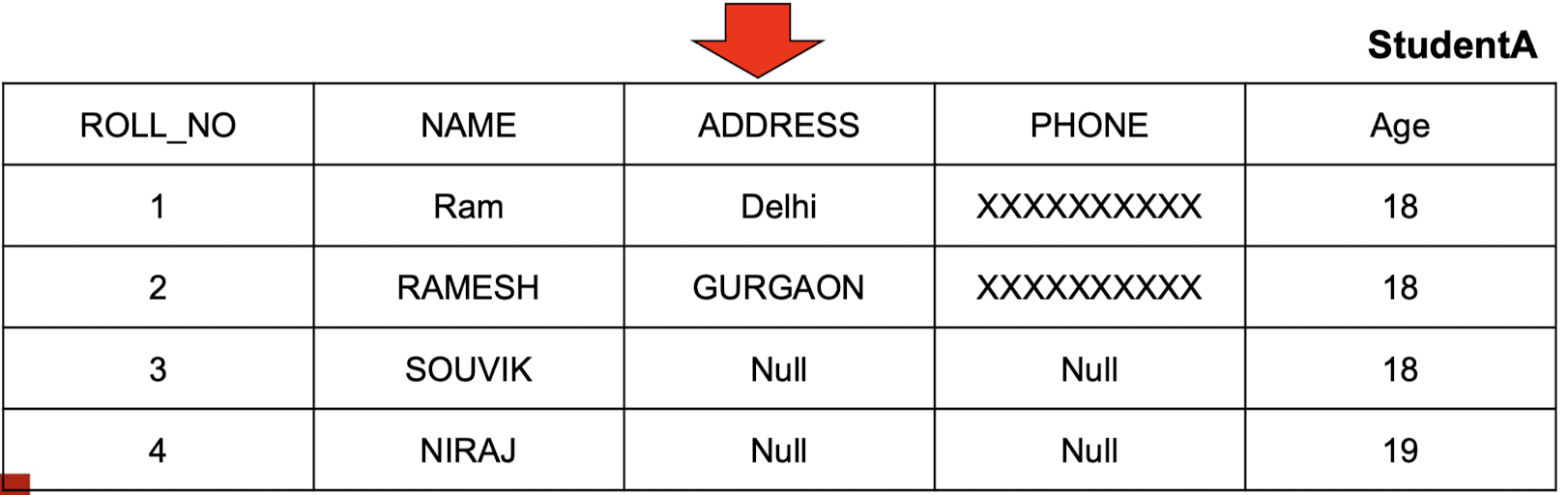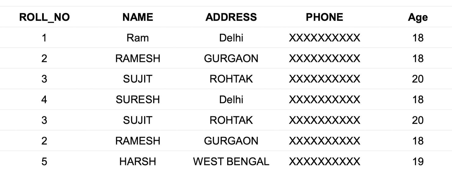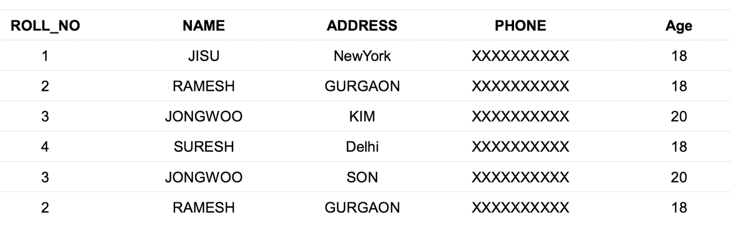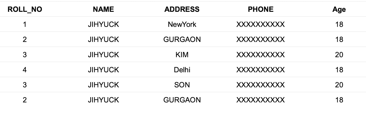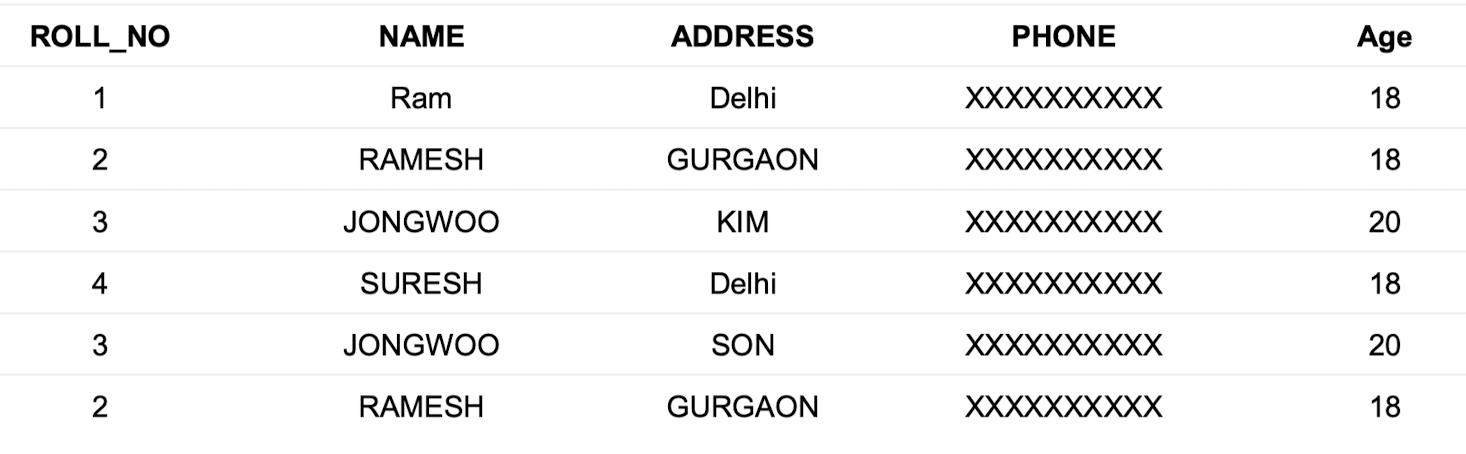 ROLL_NO가 1인 행에서NAME열을 'JISU'로,ADDRESS열을 'NewYork'으로 설정합니다.UPDATE Student SET NAME = 'JISU', ADDRESS = 'NewYork' WHERE ROLL_NO = 1;- 이 쿼리는 첫 번째 행의 두 열을 업데이트하며, 테이블