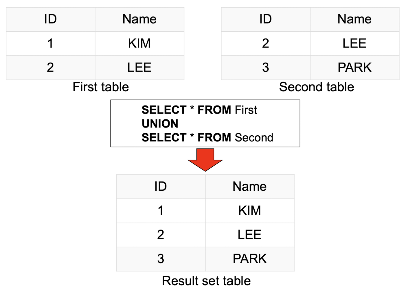 - UNION을 적용하는 테이블의 열 수와 데이터 유형은 동일해야 합니다.