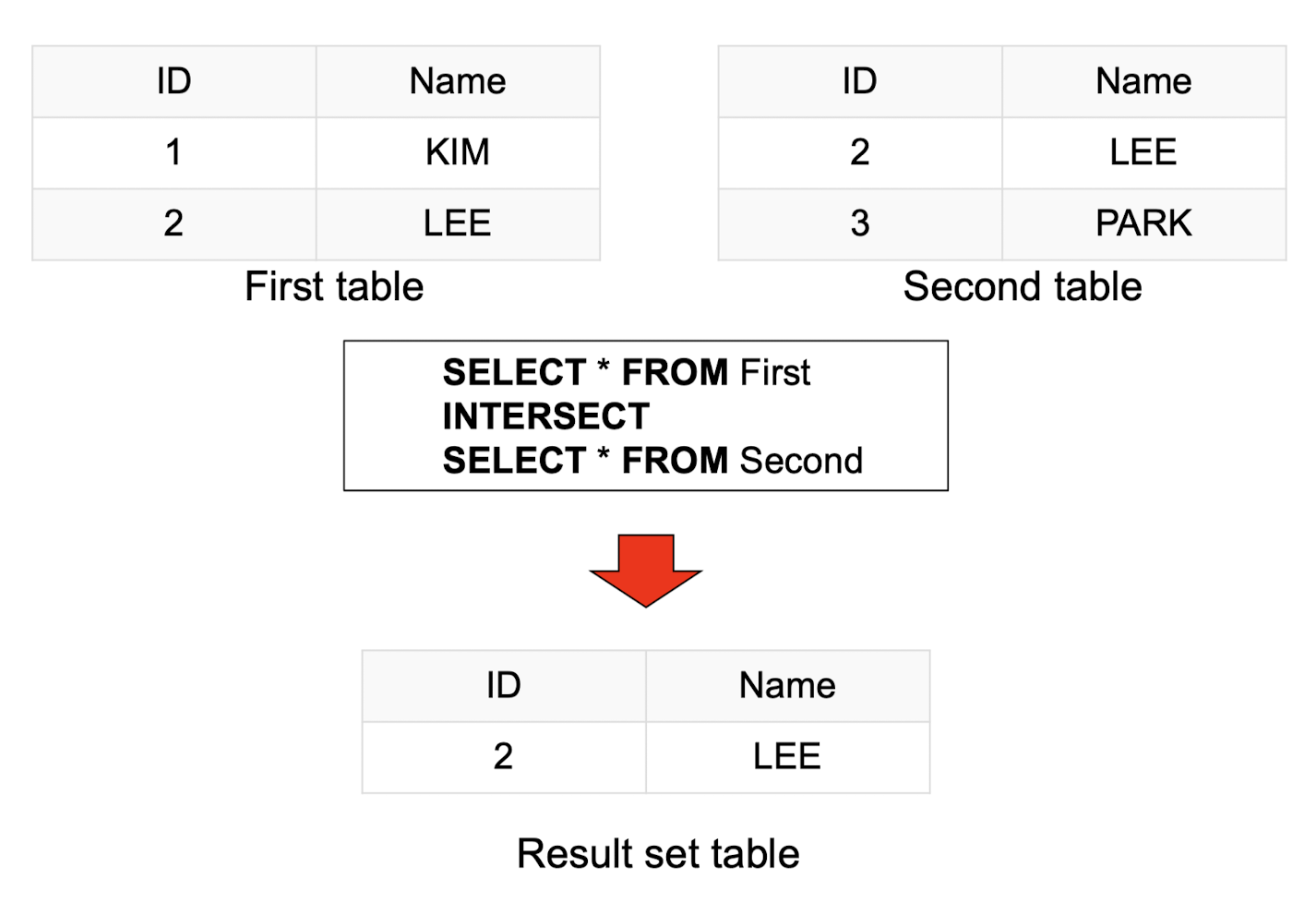 - Intersect 연산은 두 SELECT 문을 결합하는 데 사용되며, 두 SELECT 문에서 공통된 레코드만 반환합니다.