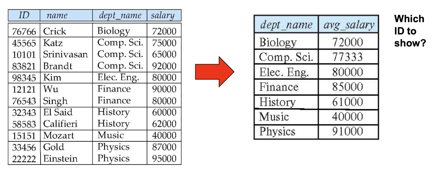 - Aggregate function 외의 select 절의 속성은 group by 목록에 나타나야 합니다.