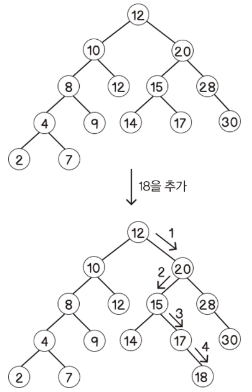 - 루트 노드부터 시작하여 각 노드를 추가할 원소와 비교하면서 원소가 삽입될 위치로 이동해야 한다