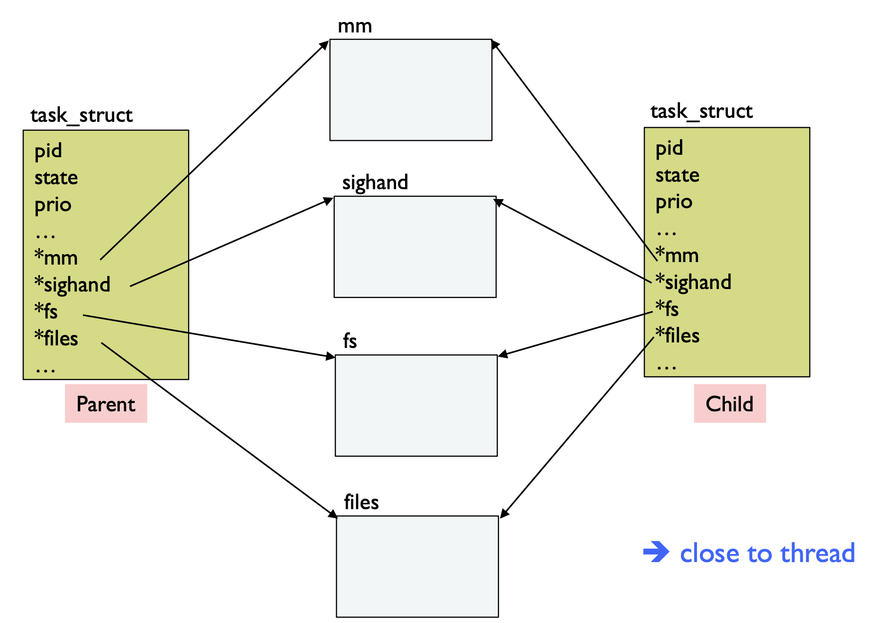 - 예시 1: clone(COLONE_VM|CLONE_FS|CLONE_FILES|CLONE_SIGHAND, 0)