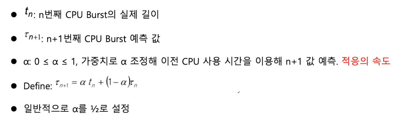 - 다음 CPU 버스트 시간의 예측값을 짧은 것을 기준으로 우선순위로 사용한다고 볼 수 있기 때문