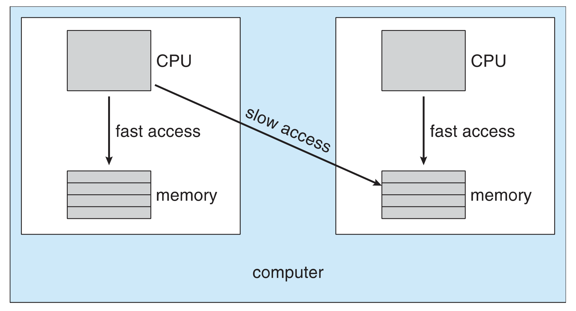 - NUMA 구조의 예시: 각 CPU가 자체 메모리에는 빠르게 접근할 수 있지만, 다른 CPU의 메모리에 접근할 때는 느려집니다.