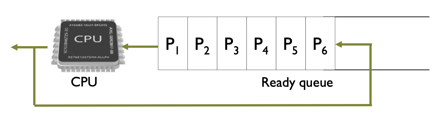 - 각 프로세스는 작은 단위의 CPU time을 얻습니다.