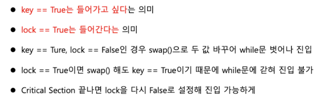- 한 프로세스가 critical section에 있을 때, 다른 프로세스는 계속해서 loop를 돌아야 합니다.