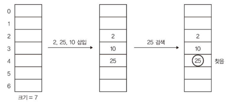 - 이 방식에서 원소 삽입, 삭제, 검색의 시간 복잡도는 O(1)