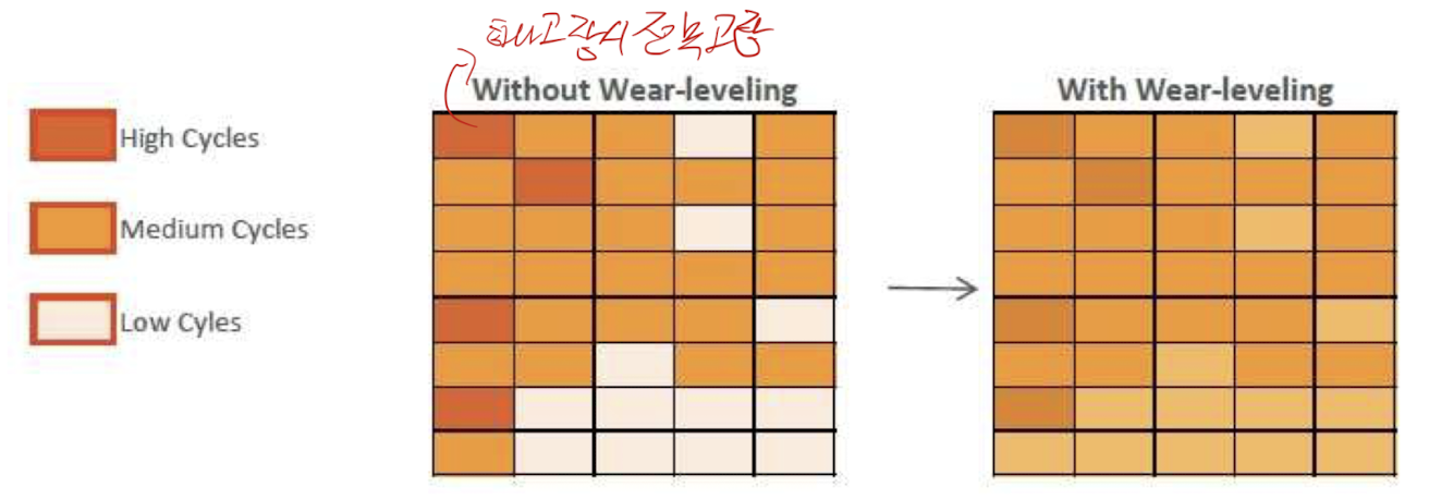 - Wear leveling은 많이 쓰여진 블록에서 데이터를 가져와 적게 쓰여진 블록으로 재배치