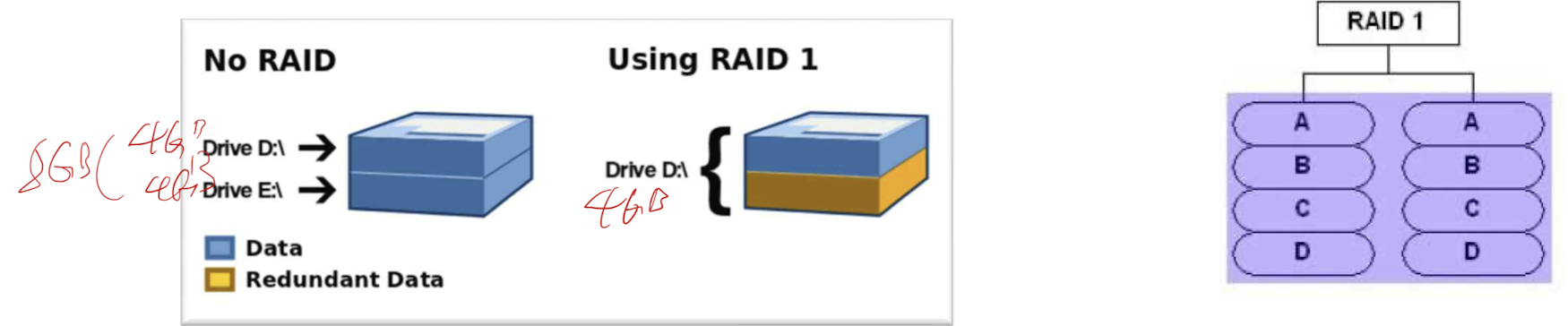 - RAID 0과 달리 드라이브의 전체 결합된 공간을 사용하는 것이 아니라, RAID 1은 중복성을 위해 절반의 공간만 사용합니다.