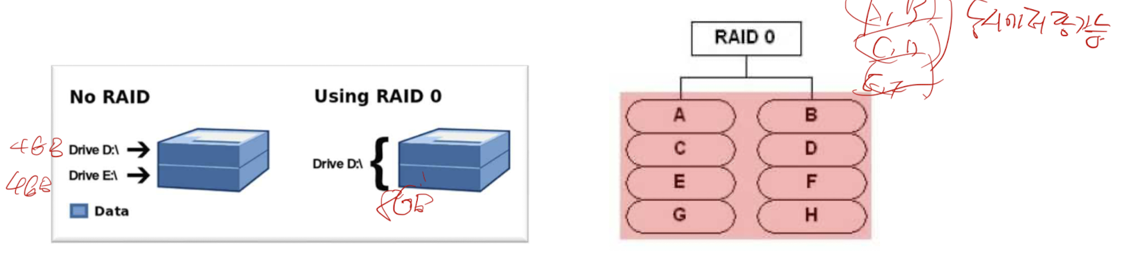 - RAID0에서는 두 개 이상의 드라이브가 하나의 단일 드라이브처럼 동작합니다.