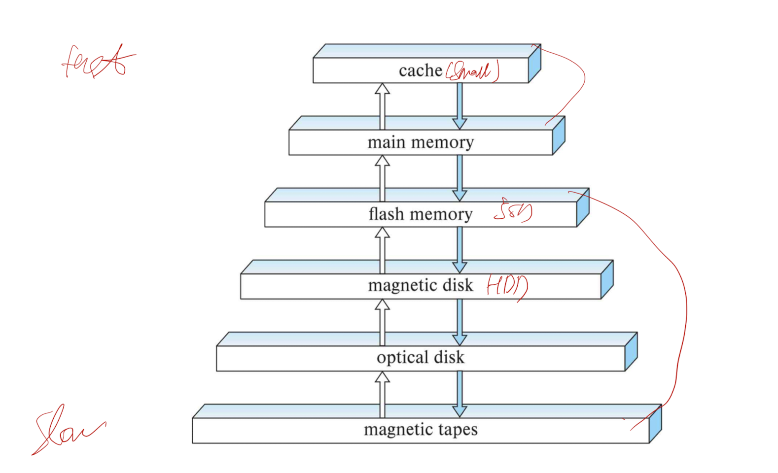 - Secondary storage: 다음 계층, non-volatile, 적당히 빠른 접근 시간