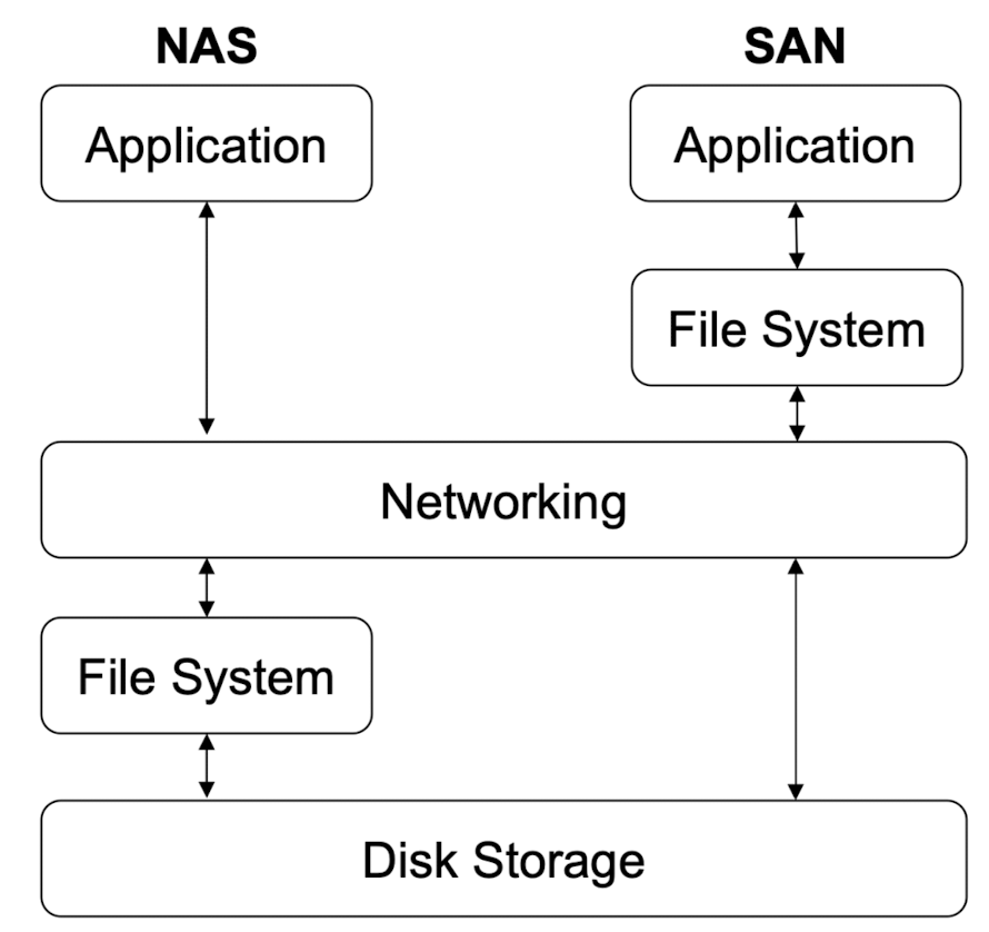 - Network Attached Storage (NAS): networked storage는 디스크 시스템 인터페이스 대신 네트워크 파일 시스템 프로토콜을 사용하여 파일 시스템 인터페이스 제공