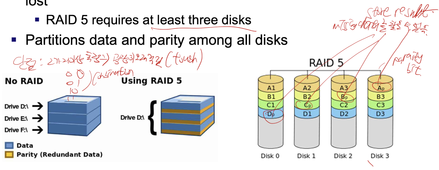 - RAID 5는 최소 세 개의 디스크가 필요합니다.