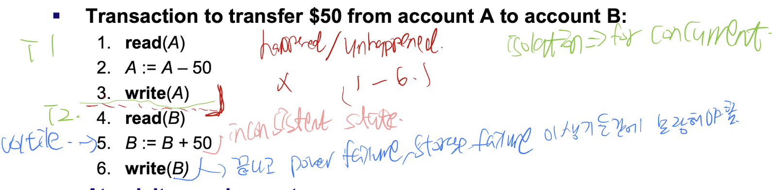 - 예를 들어, Transaction T_i가 계정 A에서 계정 B로 $50을 이체한다고 가정