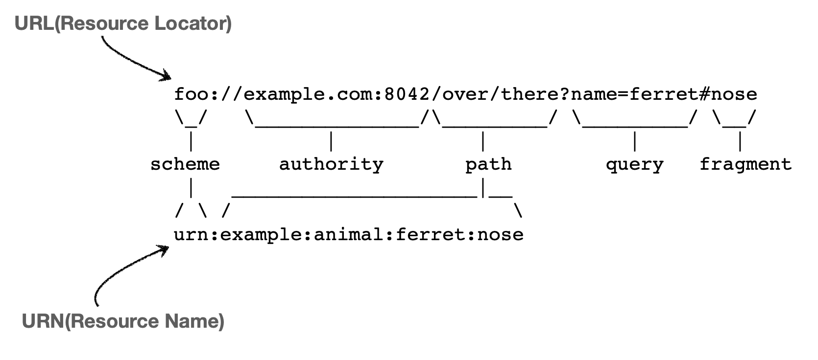 - scheme://[userinfo@]host[:port][/path][?query][#fragment]