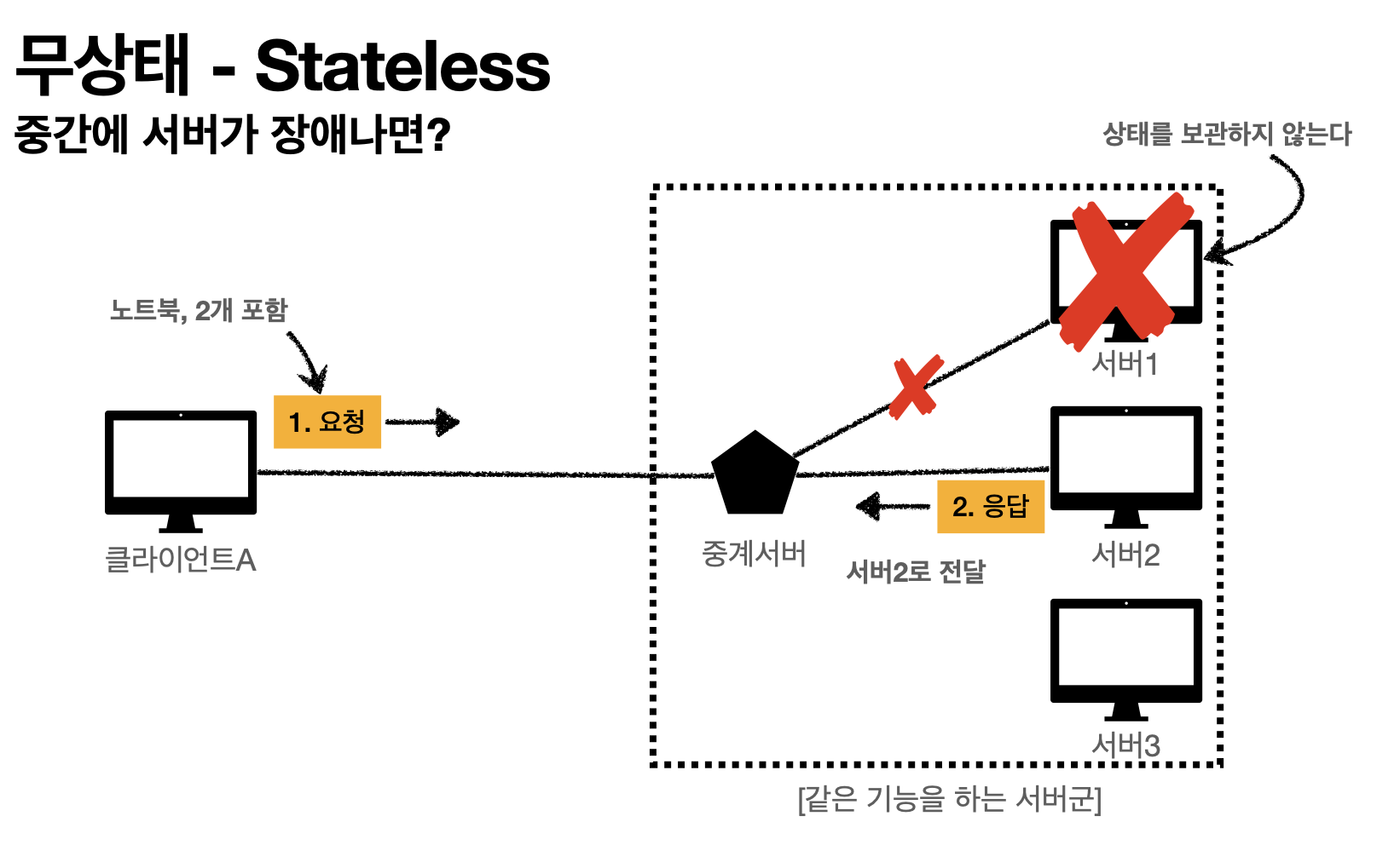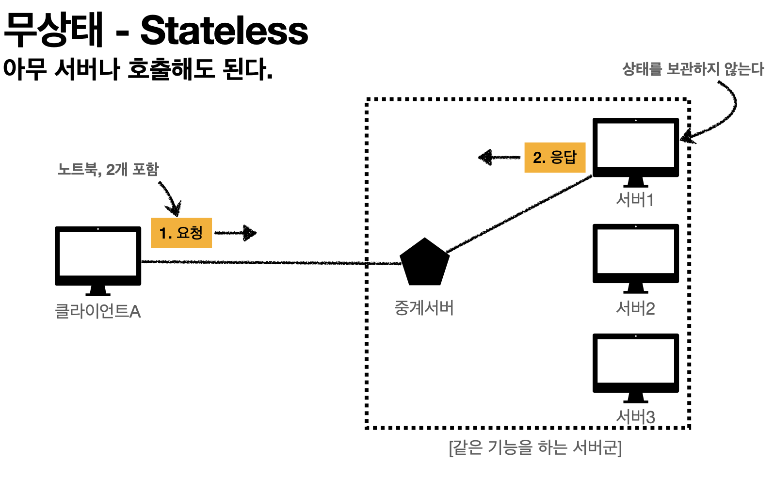 - 무상태는 응답 서버를 쉽게 바꿀 수 있다 --> 무한한 서버 증설이 가능