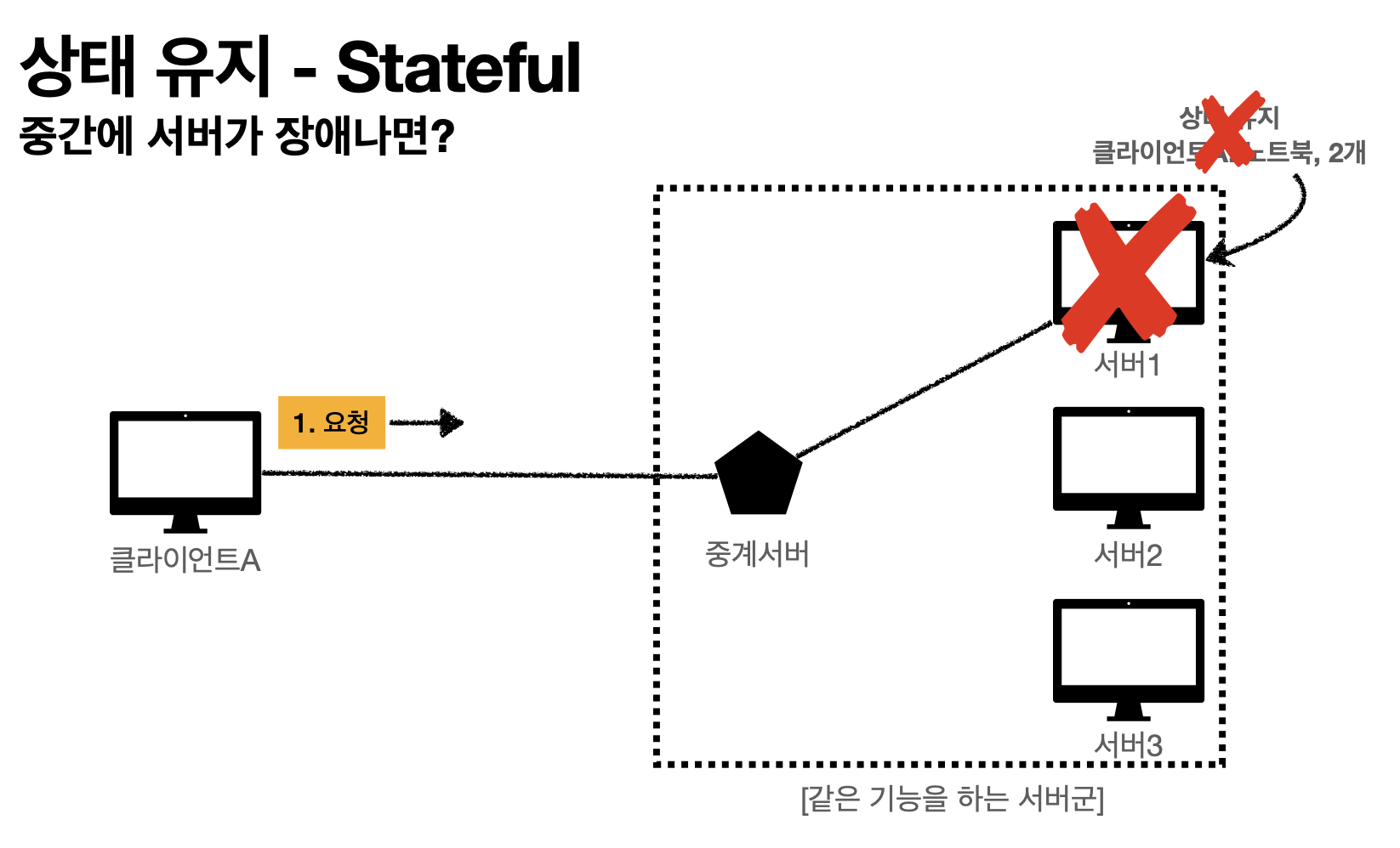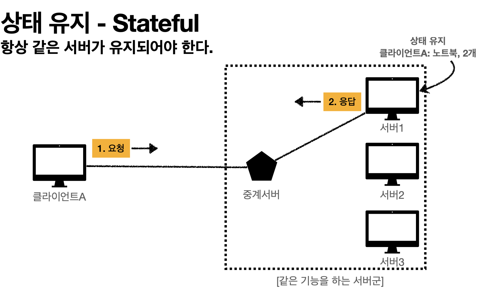 - 상태 유지(Stateful): 중간에 다른 점원으로 바뀌면 안된다. (중간에 다른 점원으로 바뀔 때 상태 정보를 다른 점원에게 미리 알려줘야 한다.)