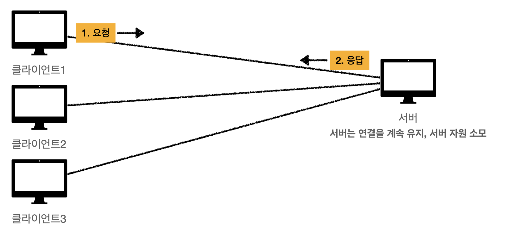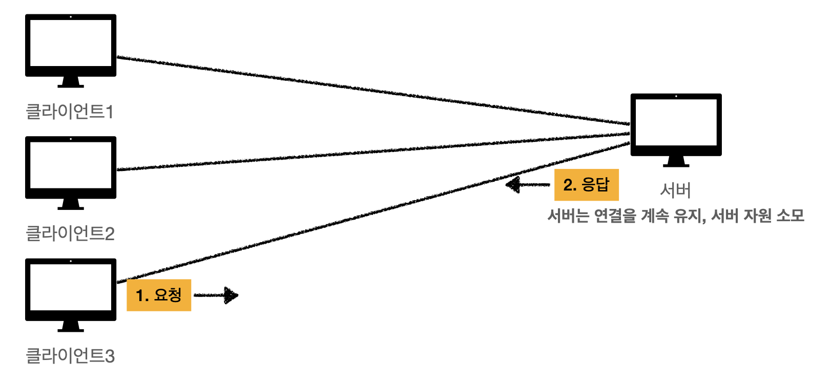 - 단점 : 클라이언트가 요청을 보내지 않아도 계속 연결을 서버가 유지해야 한다