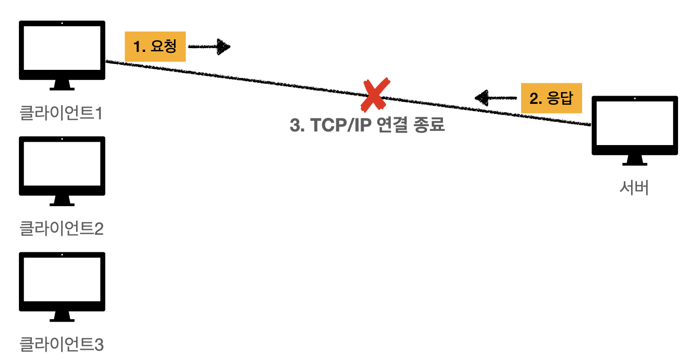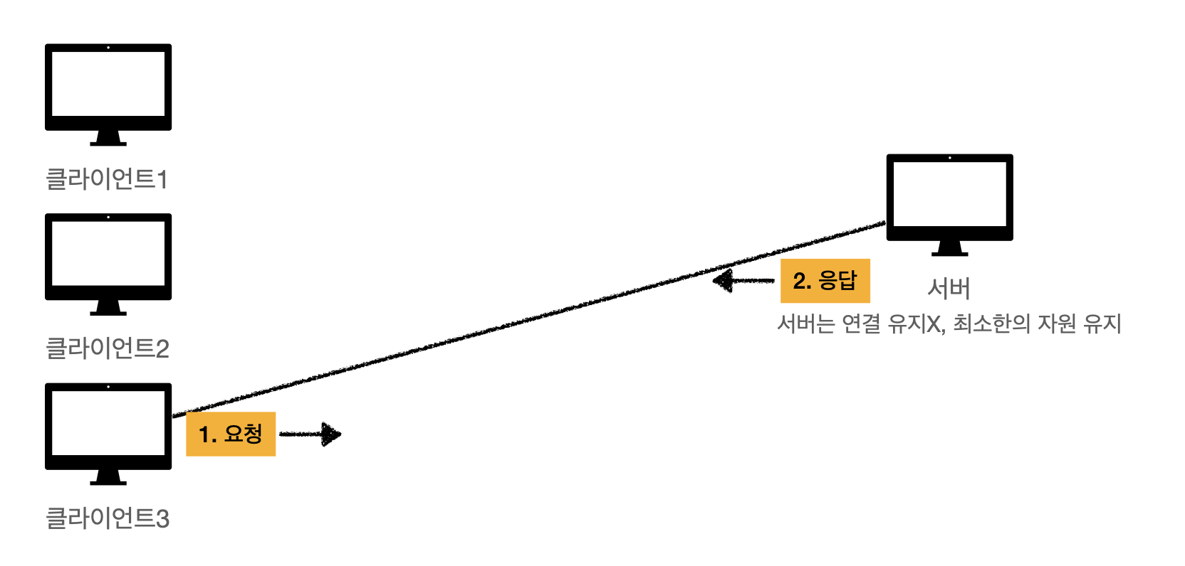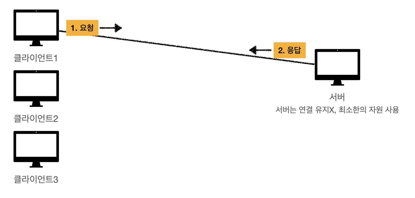 - 요청을 주고 받을 때만 연결을 하고 그 다음에는 연결을 끊어버려 서버가 유지하는 자원을 최소한으로 줄일 수 있다