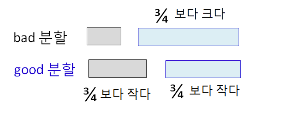 - 분할된 두 그룹 중의 하나의 크기가 입력 크기의 3/4과 같거나 그 보다 크게 분할하면 나쁜 (bad) 분할이라 하고 아니면 좋은 (good) 분할이라고 하자.