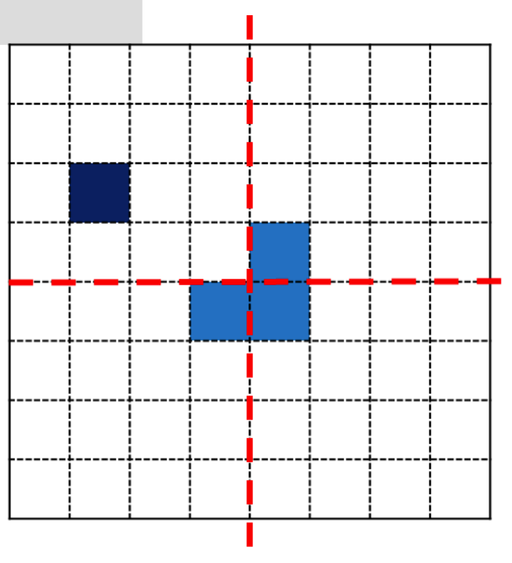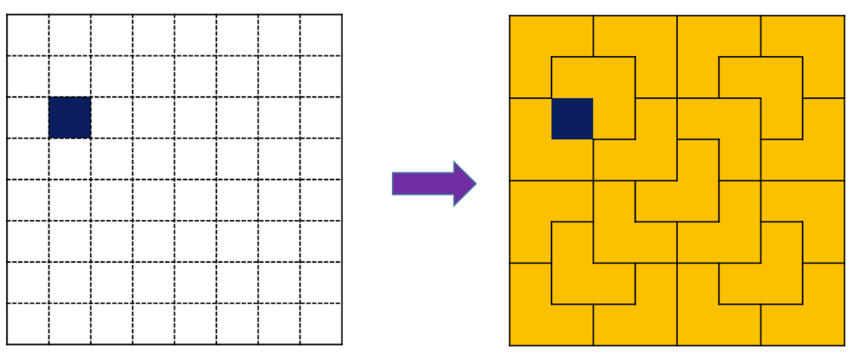 - 하나의 2^k X 2^k 체스판 문제에서 4개의 2^(k-1) X 2^(k-1) 체스판 문제로 분할한다.