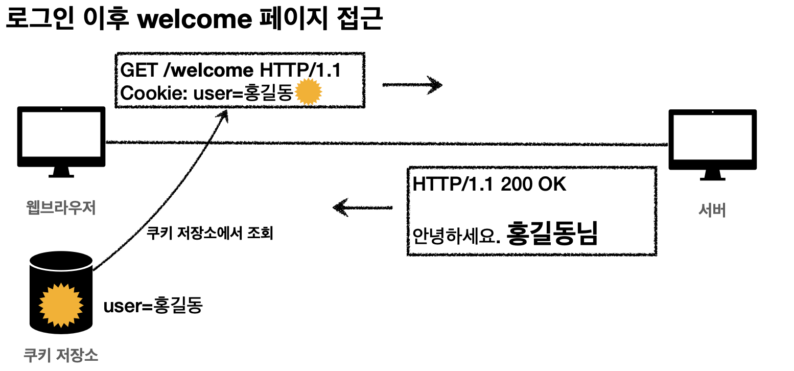 - 로그인 이후에 웹브라우저가 welcome 페이지에 들어가면 자동으로 웹브라우저는 이 서버에 요청을 보낼 때 마다 쿠키를 무조건 탐색해서 찾은 뒤 http 헤더를 만들어서 서버에 보낸다