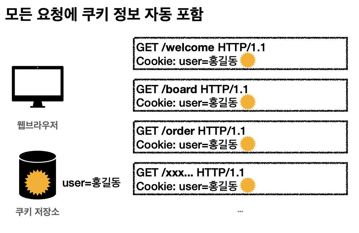 - 쿠키는 모든 요청 정보에 쿠기 정보를 자동으로 포함한다