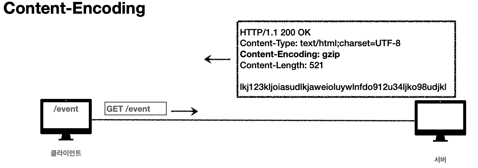 - ex) 서버가 클라이언트에 압축을 해서 보낼 때, 클라이언트가 어떤 것으로 압축이 되어있는지 부가 정보를 보내주기 위해 Content-Encoding을 헤더에 적어준다