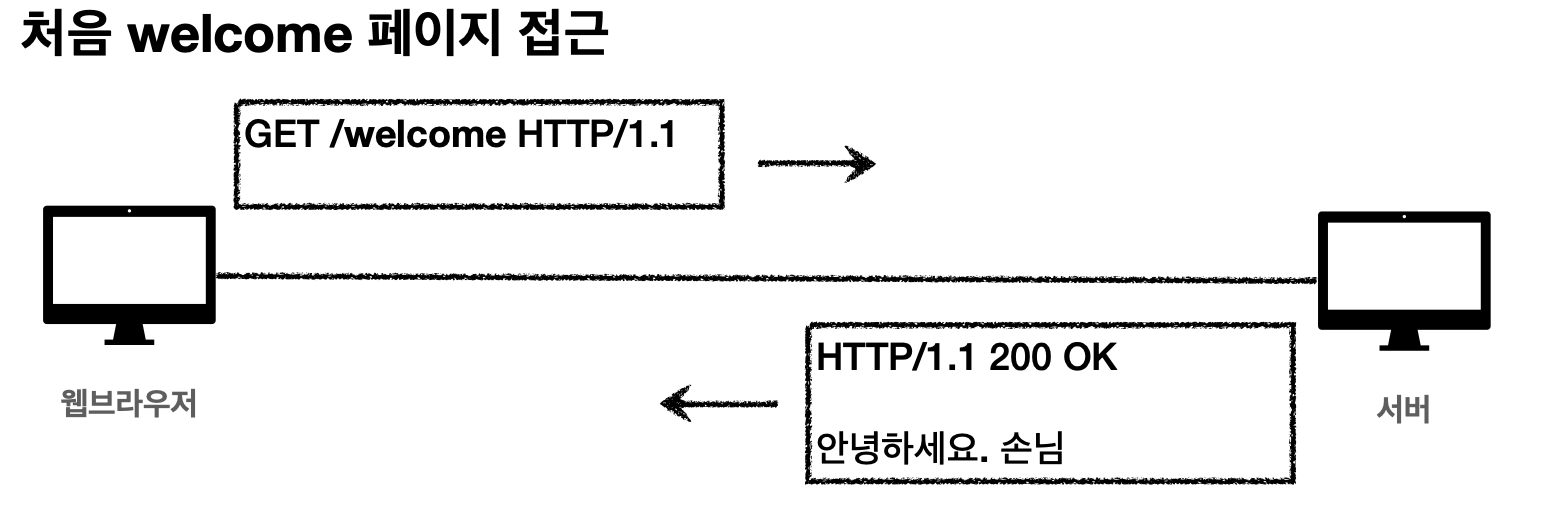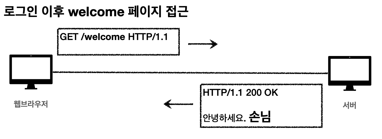 - 로그인하고 /welcome 페이지에 들어가면 서버는 "안녕하세요 홍길동" 이 아니라 "안녕하세요 손님"으로 내린다