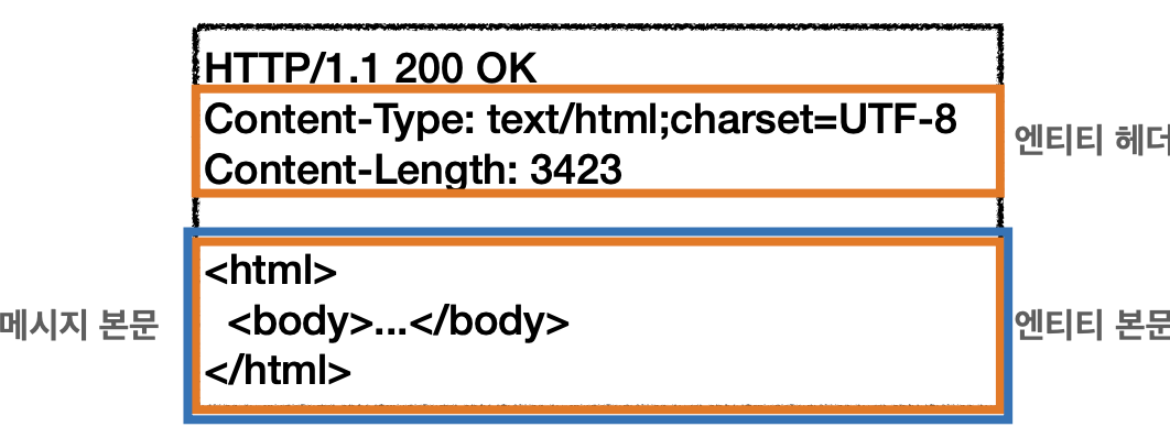 - Entity 헤더: 엔티티 바디 정보, 예) Content-Type: text/html, Content-Length: 3423