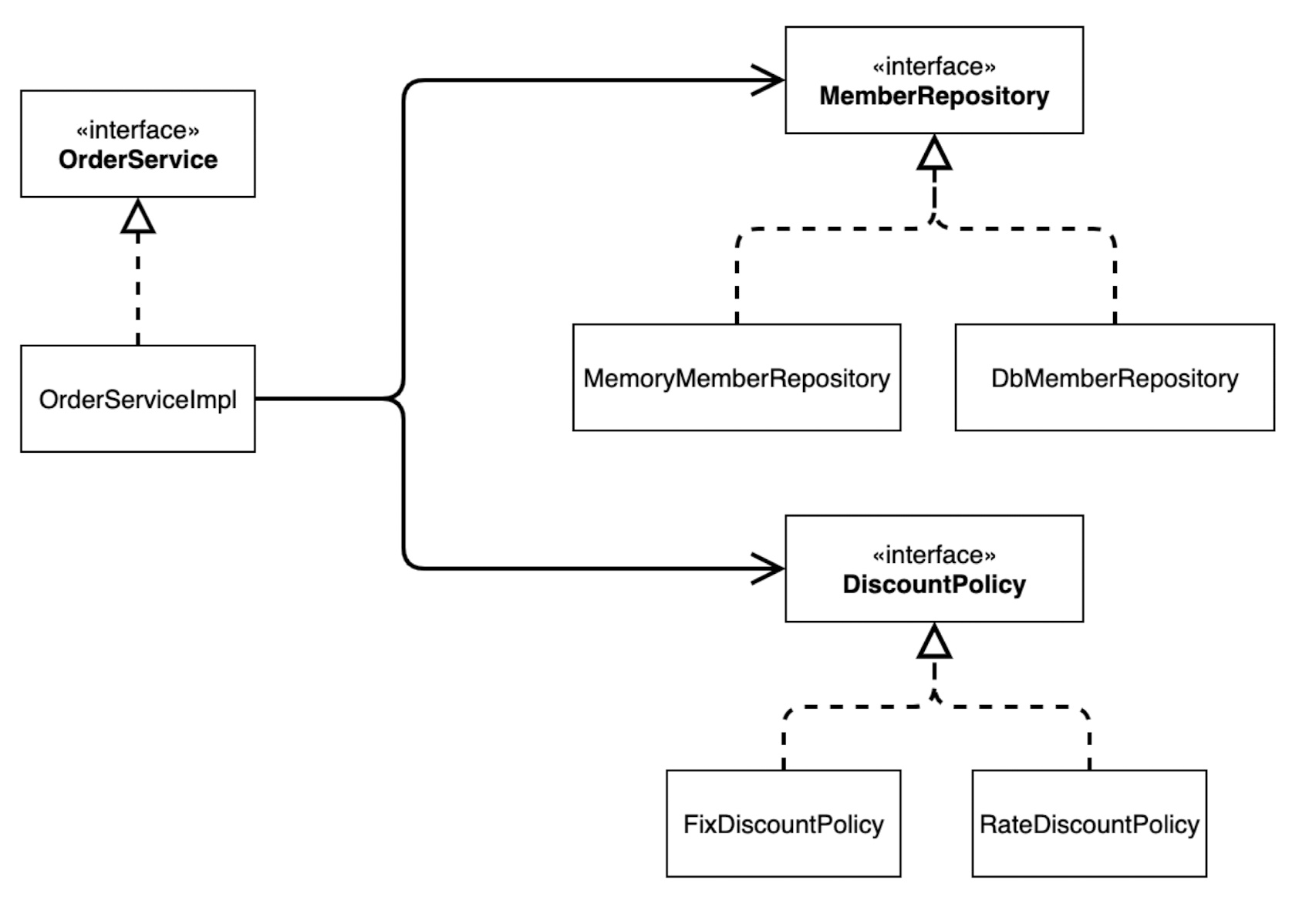 - memberRepository, DiscountPolicy 인터페이스 또한 참조하고 있음을 알 수 있다.