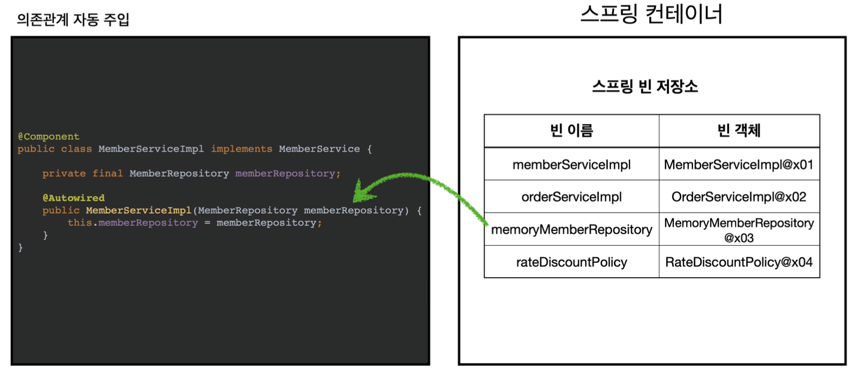 - @Autowired에 있는 생성자가 실행되면서 스프링 컨테이너에 있는 MemberRepository를 찾는다. (타입으로 조회)