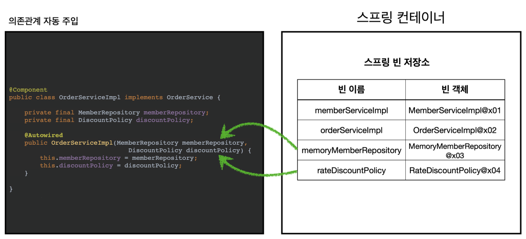 }- 이전에 AppConfig에서는 @Bean으로 직접 설정 정보를 작성했고, 의존관계도 직접 명시했다. 이제는 이런 설정 정보 자체가 없기 때문에, 의존관계 주입도 이 클래스 안에서 해결해야 한다.