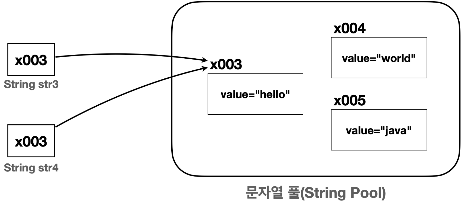 참고: 풀(Pool)은 자원이 모여있는 곳을 의미한다. 프로그래밍에서 풀(Pool)은 공용 자원을 모아둔 곳을 뜻한다. 여러 곳에서 함께 사용할 수 있는 객체를 필요할 때 마다 생성하고, 제거하는 것은 비효율적이다. 대신에 이렇게 문자열 풀에 필요한