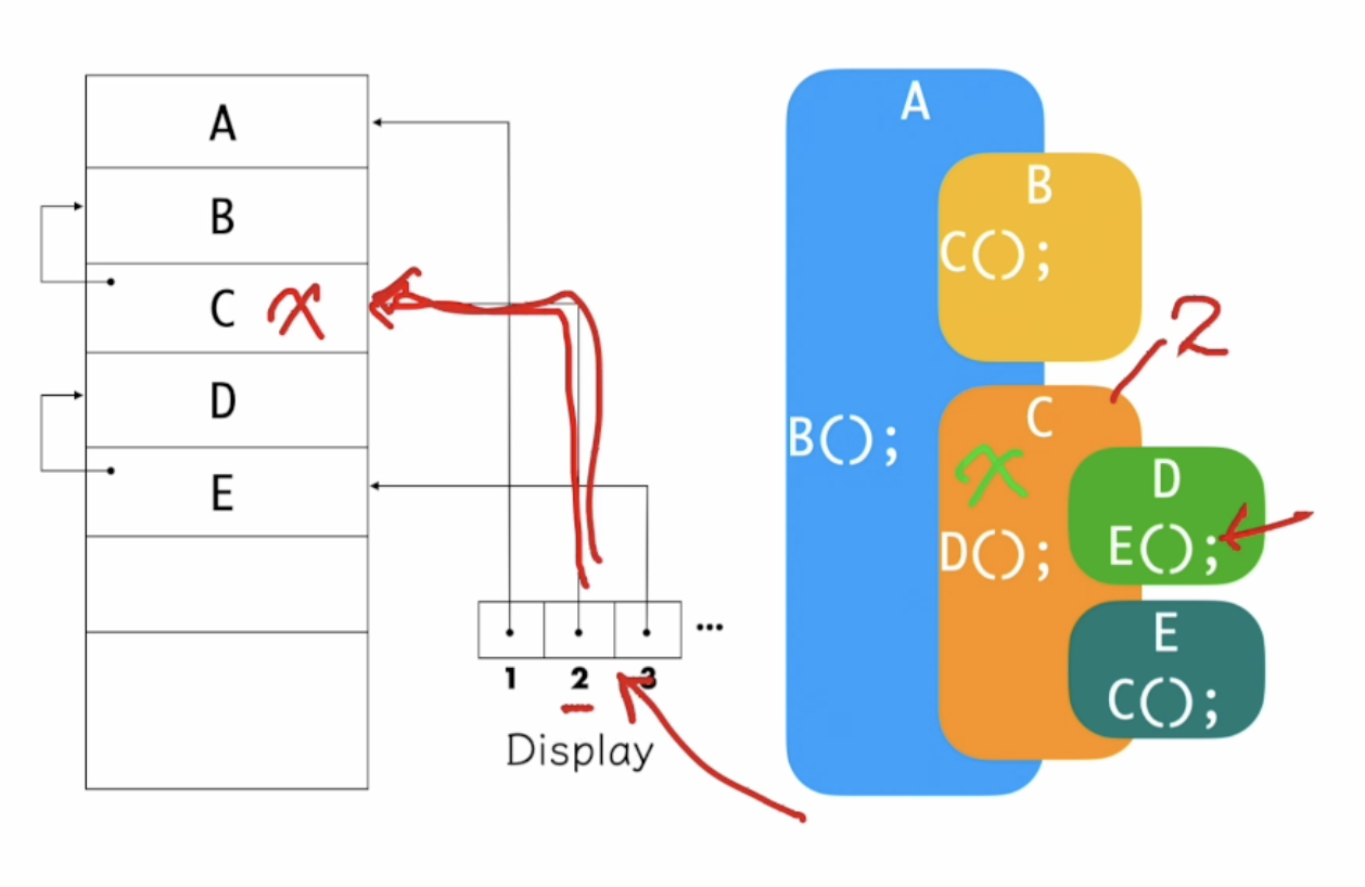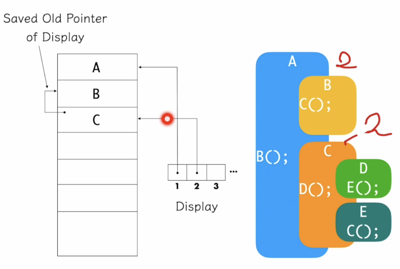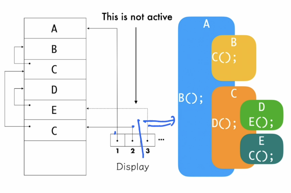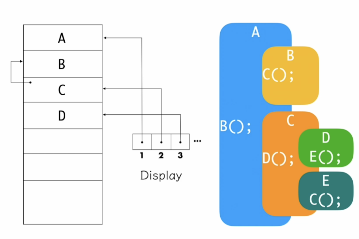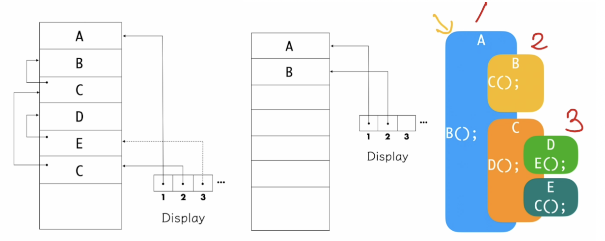 - callee(블록 D)가 caller(블록 C) 내부에 있을 경우(= 레벨이 증가하는 경우), 디스플레이의 길이를 늘려 다음 요소(3번째 요소)에 포인터를 넣는다.