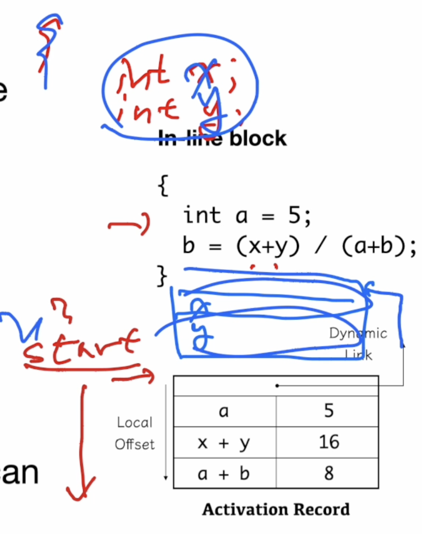 - procedure activation or inline block에 할당된 각 메모리 공간을 activation record or _frame_이라 한다.