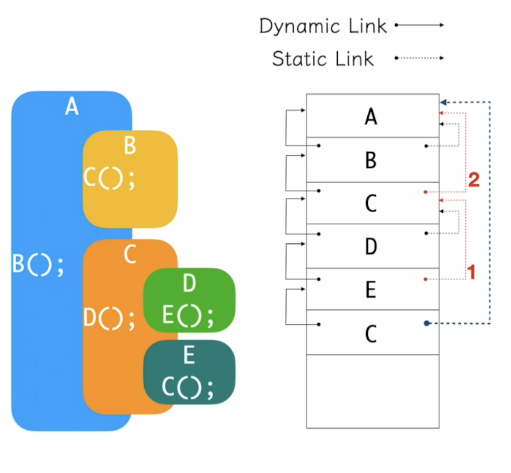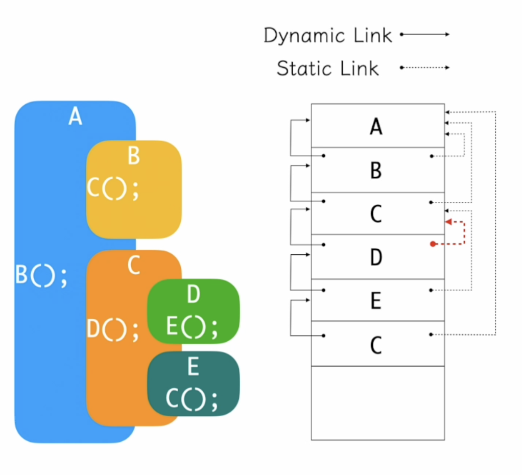 - C가 E랑 static link를 맺는게 아니라, C의 direct outside block인 A와 Static Link를 한다.