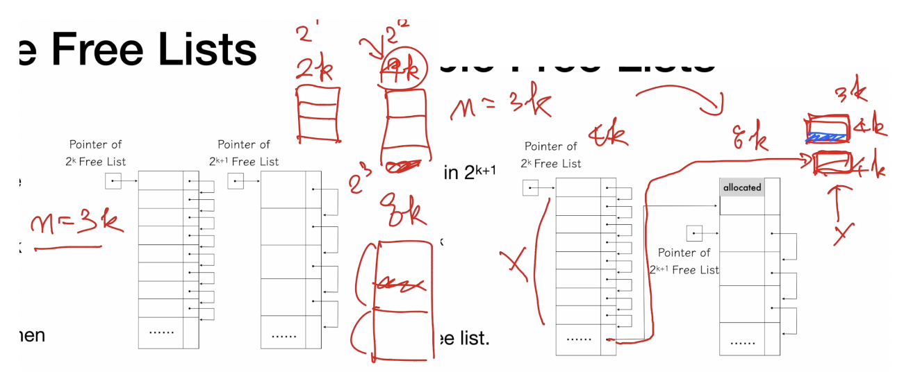 - 2^k 하나는 할당되고, 나머지 하나는 2^k free list에 연결된다