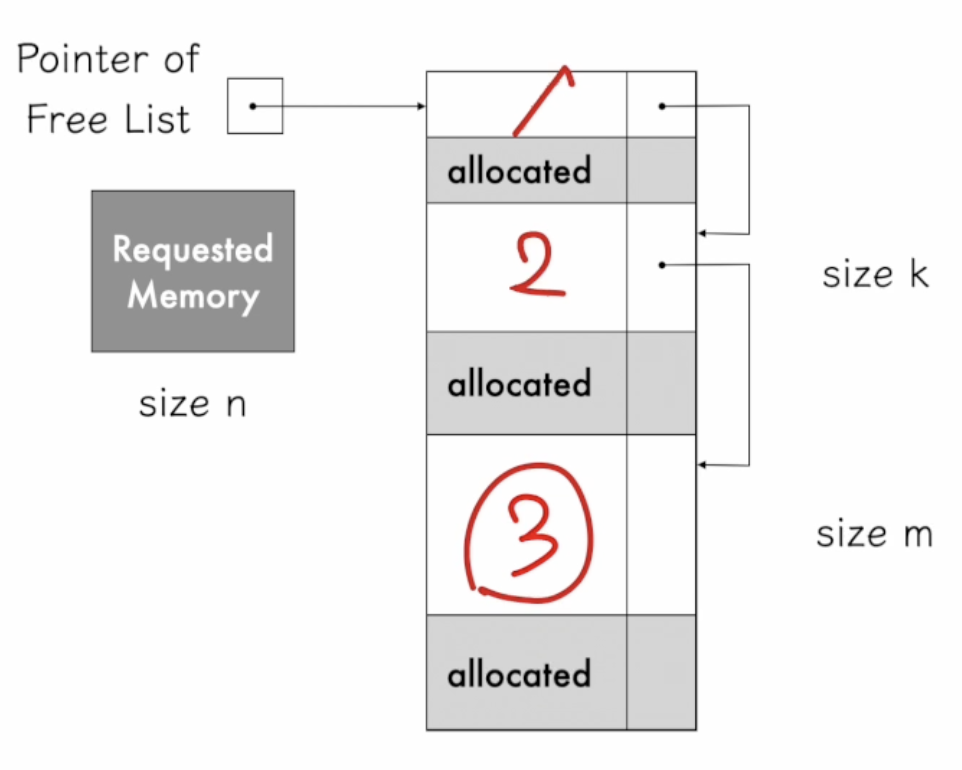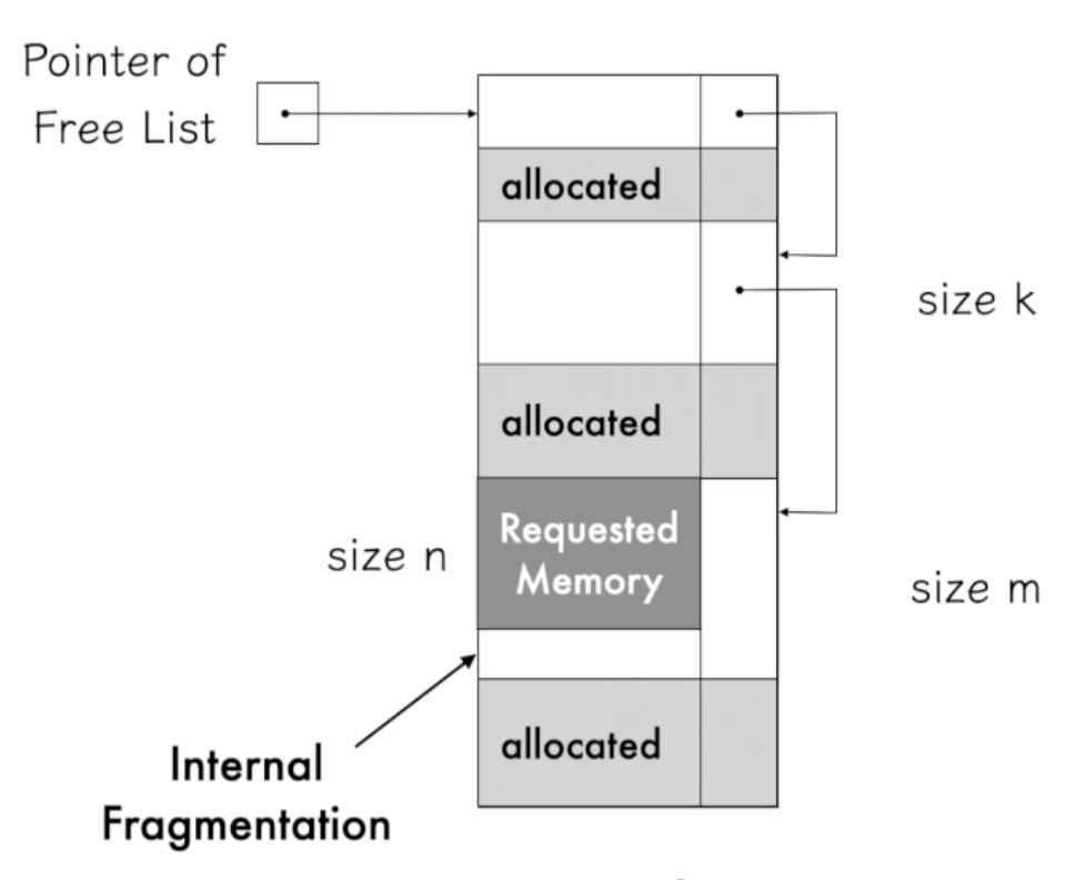 애도 free list를 사용하지만, block의 크기가 다를 수 있다. 요청된 크기에 맞는 block을 할당해준다.