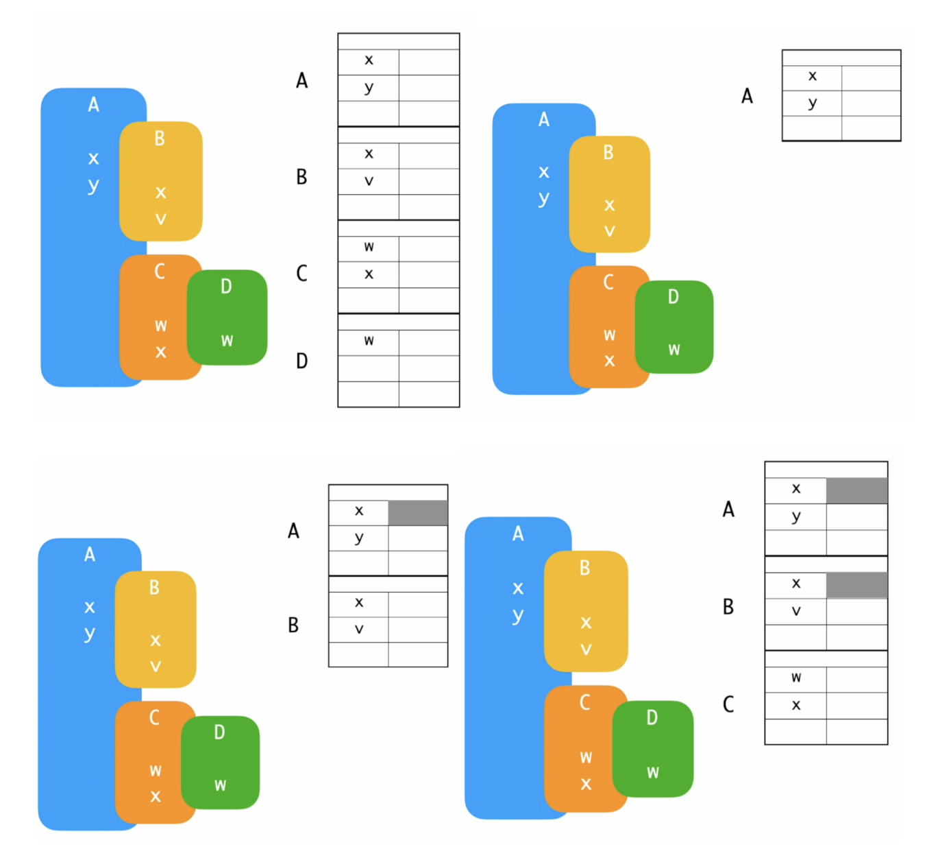 - A, B, C, D 호출을 생각해봅시다. 회색으로 표시된 것은 deactivated된 바인딩을 나타낸다.