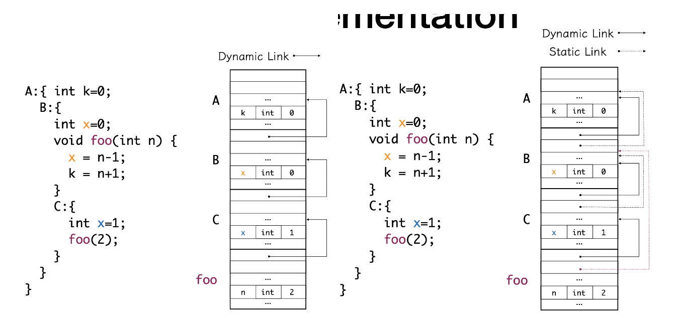 - ex) 프로시저 foo에서 변수 x는 블록 B의 x를 참조하지만(선언 기준), dynamic link로 foo에 연결된 activation record는 블록 C입니다. (실행 기준이니까)
