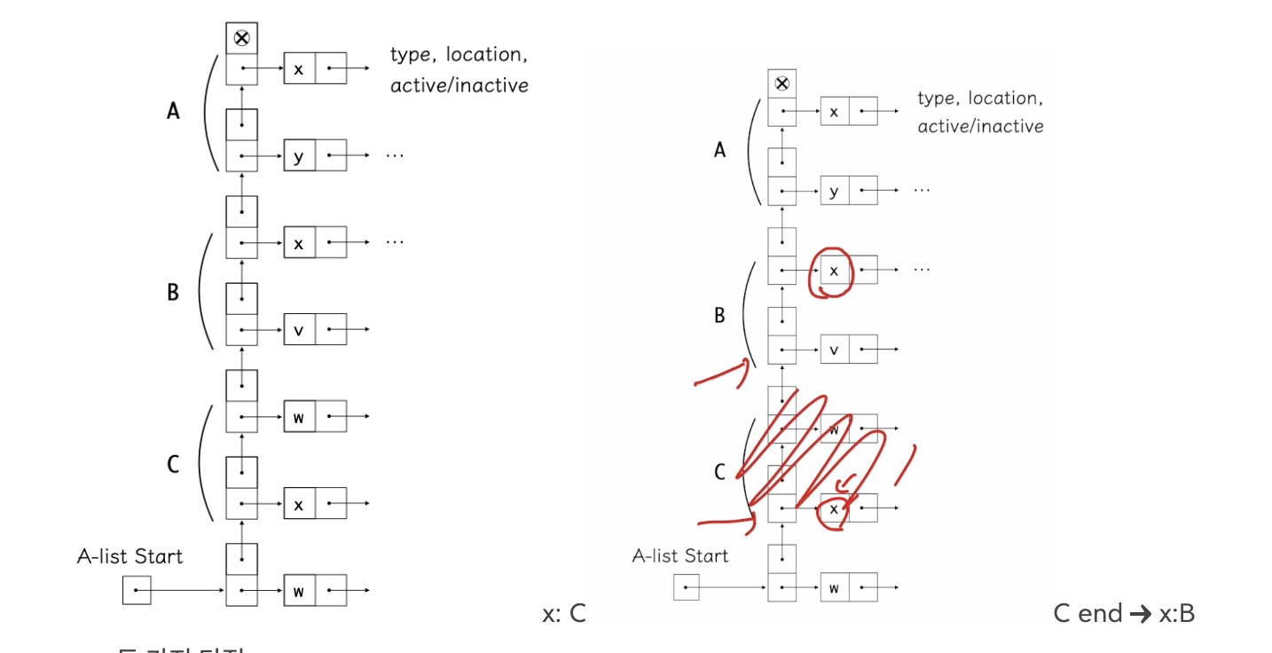 - Activation Record에 직접 바인딩을 저장하는 대신, 바인딩을 Association list(A-list)에 별도로 저장할 수 있습니다.