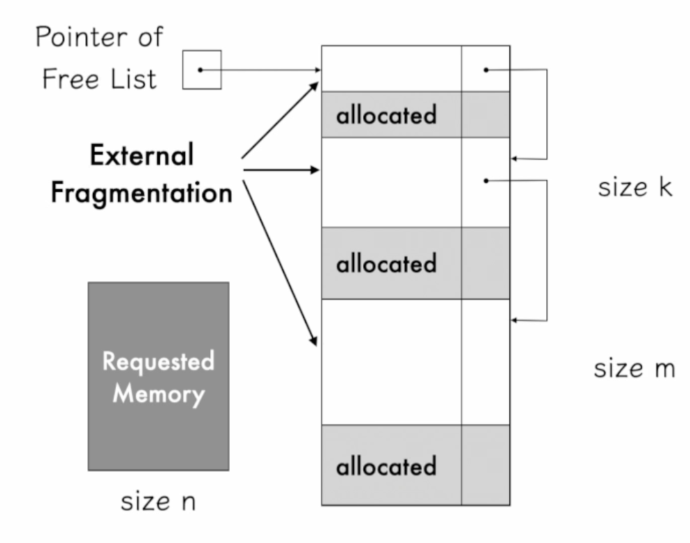 free block들이 흩어져 있어 요청된 메모리를 할당할 수 없는 경우를 말한다.