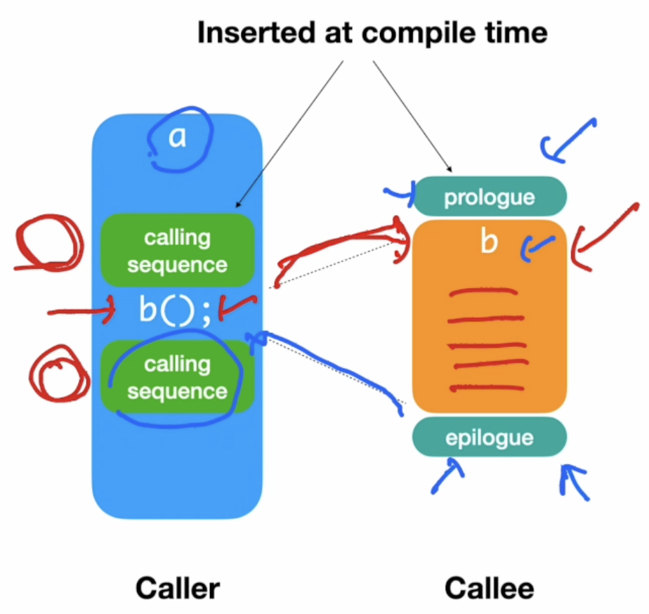- Calling Sequence는 컴파일러에 의해 프로시저 호출 직전과 직후(immdediately before and after)에 삽입된다.