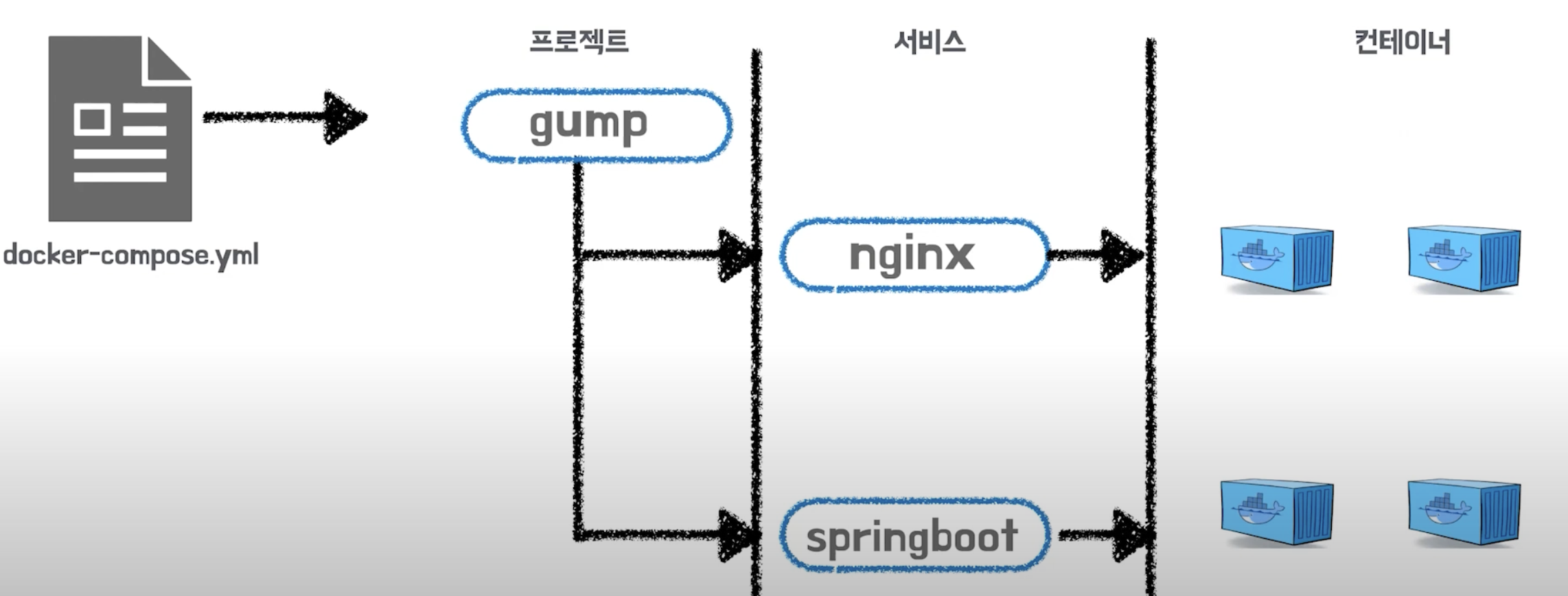 하나의 프로젝트는 여러개의 서비스로 이루어지고, 하나의 서비스에는 여러 개의 컨테이너가 존재할 수 있다.
